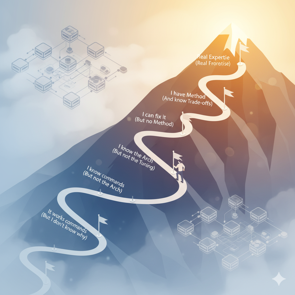 A winding mountain path going up from the bottom left to the top right. The path is divided into 6 sections, each with a small flag or milestone marker. The sections are labeled with the stages from the article: "It works (But I don't know why)", "I know commands (But not the Arch)", "I know the Arch (But not Tuning)", "I can fix it (But no Method)", "I have a Method (And know Trade-offs)", "Real Expertise". A stylized figure climbs the path. The lower sections are foggy and the path is less clear, while the upper sections are sunny and well-defined. In the background, a schematic of a Ceph cluster (nodes and lines)