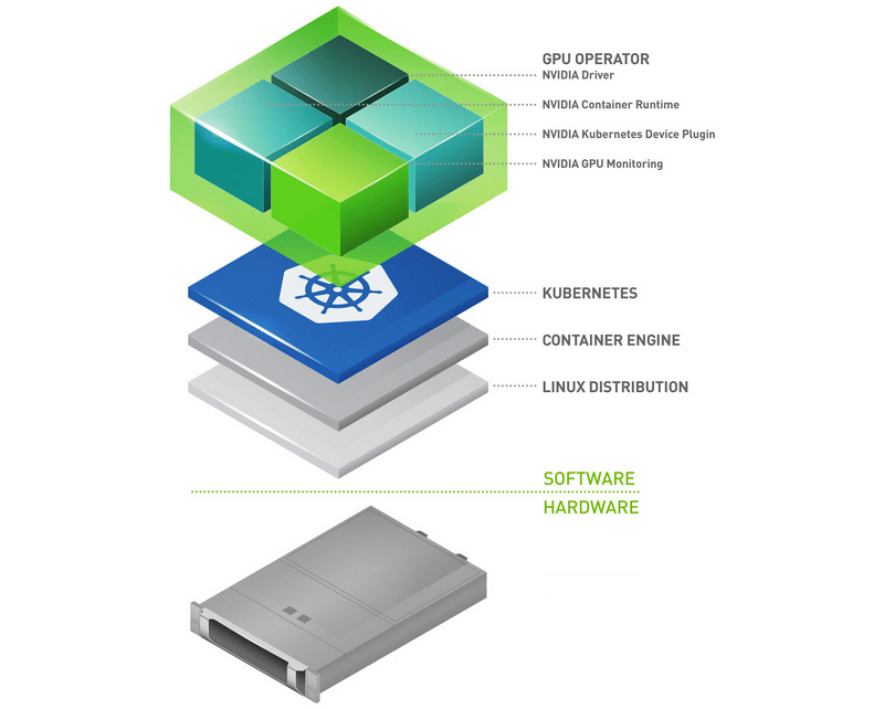 NVIDIA y Red Hat OpenShift se han unido para ayudar en la ejecución de aplicaciones de IA. Al usar GPU como procesadores de alta computación, el mayor problema es virtualizar o distribuir la energía de las GPU en los contenedores. NVIDIA GPU Operator for Red Hat Openshift es un Kubernetes que media la programación y distribución de los recursos de GPU. Dado que la GPU es un recurso especial en el clúster, requiere que se instalen algunos componentes antes de que las cargas de trabajo de la aplicación se puedan implementar en la GPU, estos componentes incluyen: