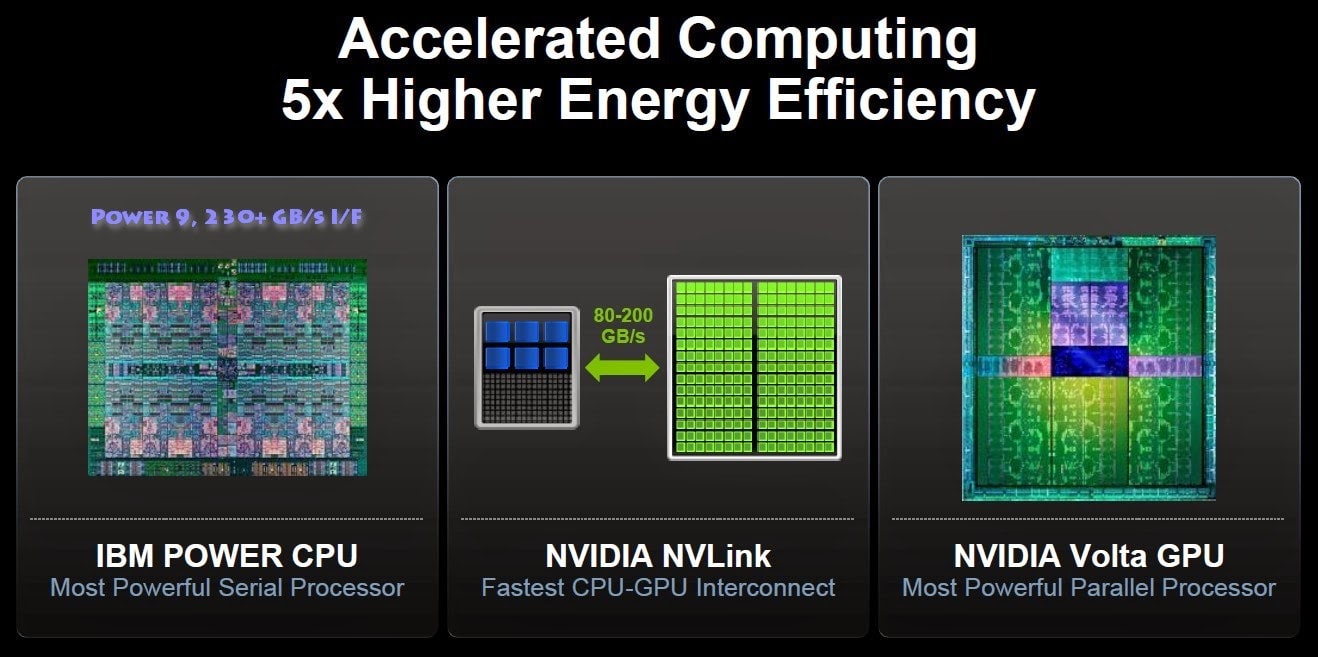 El segundo punto a considerar es el ancho de banda entre LAS GPU y las CPU. En arquitecturas tradicionales como Intel, este tráfico se transfiere a través de canales PCI. IBM desarrolló un conector llamado NVLink,para que las GPU de la tarjeta NVidia y los núcleos Power9 pudieran comunicarse directamente sin capas intermedias. Esto multiplica el ancho de banda, que ya es más de 2 veces mayor entre el procesador y la memoria. Resultado: ¡no más cuellos de botella!